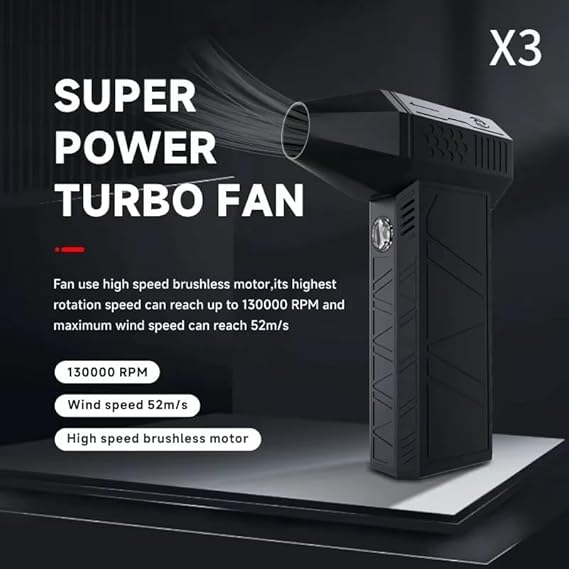 The Mini Turbo Jet Fan with 130,000 RPM and 52m/s wind speed is a portable powerhouse, designed for high-speed performance in any situation. Whether you're using it for cleaning dust and debris, drying damp surfaces, or cooling down on a hot day, this mini jet fan provides powerful airflow to get the job done. With a 3000mAh rechargeable battery, this fan ensures hours of reliable use, offering cordless convenience for both indoor and outdoor activities. It’s ideal for a range of uses, from cleaning your garage or workspace to cooling off during camping trips or outdoor adventures. The fan's ergonomic and compact design makes it easy to carry and use for extended periods without discomfort. Lightweight yet powerful, it’s perfect for those who need a reliable, portable solution for cleaning, cooling, or even drying gear.